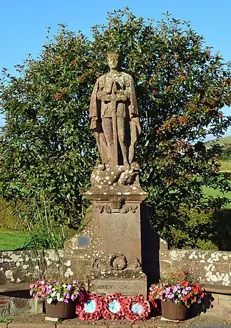 W.G. Collingwood, who had been John Ruskin's secretary drew up a design for a memorial based upon the old cross shaft in the Priory graveyard. This design was used for the official Village memorial by the Lych Gate. However, J.D. Kenworthy of Seacroft, who had lost his eldest son in the War, thought that memorial lacked impact and was in the wrong place, so the second village war memorial was designed and erected near the railway station in the centre of the village by J.D. Kenworthy.[13] It is made of St Bees red sandstone hewed from a local quarry. This memorial shows the Patron Saint of England, St George standing on top of the dragon that, according to tradition, he had conquered. This memorial lists the names of 27 villagers who died in the 1st World War (i.e. one more than Collingwood's memorial). At the base of the memorial sculpture is the following inscription reinforcing J.D. Kenworthy's reasoning for the second memorial: "To Awaken Remembrance".[14] The ceremony took place in August 1923.[15] Today both are looked after by the Parish Council as village war memorials.