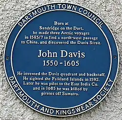 Davis was born in the parish of Stoke Gabriel in Devon circa 1550, and spent his childhood in Sandridge Barton nearby. It has been suggested that he learned much of his seamanship as a child while playing boats along the river Dart, and went to sea at an early age. His childhood neighbours included Adrian Gilbert and Humphrey Gilbert and their half-brother Walter Raleigh.[1] From early on, he also became friends with John Dee.[2]