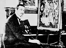 Born in 1915 in New York City on Staten Island, John Dehner was the middle child of three children of Ella Susana (née Dehner) and Ralph LeRoy Forkum.[2][a] Dehner's father was an accomplished artist who was widely recognized in the United States as a landscape painter, illustrator, and a specialist in painting "highly realistic" backgrounds for stage productions and later for animated features and shorts.[3][b] Dehner's mother was a gifted musician with artistic talents as well.[4] Prior to the 1920s, Ella Forkum even collaborated with her husband on art projects and in some instances was co-credited for helping him to compose content for his drawings and paintings widely used in newspaper and magazine advertising. One example is a full-page advertisement in the March 18, 1917, issue of the Washington, D.C., newspaper Evening Star.[5] That ad is for Djer-Kiss, a very exclusive line of French perfumes and soaps. It depicts a highly stylized, fairytale-like scene of young women bathing beneath a waterfall. The artwork itself bears the attribution to both of Dehner's parents, to "R.L. + E.D. Forkum".[5]