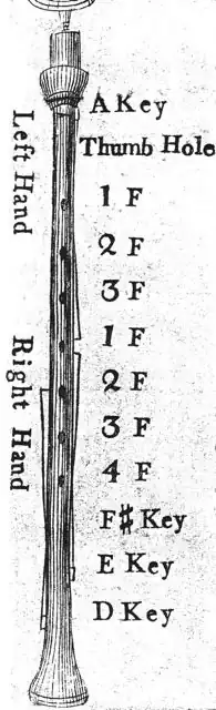 The earliest evidence of such a keyed chanter is the illustration and fingering chart in John Peacock's tunebook, A Favorite Collection of Tunes with Variations Adapted for the Northumberland Small Pipes, Violin, or Flute,[3] first published by William Wright, of Newcastle, in about 1800. This depicts a simple keyless chanter with an octave range from G to g, as well as J. Peacock's New Invented Pipe Chanter with the addition of Four Keys, these keys were for the notes low D, E, F sharp, and high a. Subsequent makers, particularly Robert Reid, added more keys to extend the range further, and include chromatic notes.