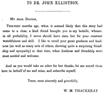 He was highly regarded in literary circles. WM Thackeray's Pendennis was dedicated to his friend, Elliotson;[2] and the character, Dr Goodenough (in Thackeray's last novel, The Adventures of Philip (1862), was based on Elliotson,[27] who had attended Thackeray when suffered a life-threatening illness in 1849.[28]