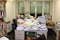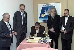 Ellis' activities at CERN have been wide-ranging in addition to his research.[14][15] He was twice Deputy Division Leader for the theory ("TH") division, and served as Division Leader for 1988–1994.[10] He was a member of the committees that selected experiments at the LEP[16] and LHC accelerators[17] and participated in early studies of possible future colliders such as CLIC[18] and FCC.[19] In the early 2000s he advised successive CERN Directors-General on relations with non-member states.[20] He was also the first chair of CERN's Equal Opportunities Advisory Panel.[21]