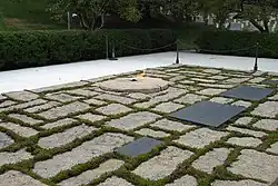 The John F. Kennedy Eternal Flame is a presidential memorial at the grave site of assassinated United States President John F. Kennedy, in Arlington National Cemetery in Virginia. This permanent site replaced a temporary grave and eternal flame used at the time of Kennedy's state funeral on November 25, 1963, three days after his assassination. The site was designed by architect John Carl Warnecke, a longtime friend of Kennedy.[1][2] The permanent John F. Kennedy Eternal Flame grave site was consecrated and opened to the public on March 15, 1967.[3]