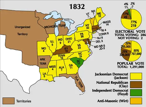 The Nullification Crisis had been ongoing since 1828, and in December 1832, Jackson came down squarely against "the nullifiers" in his proclamation. However, in the presidential election of 1832, Jackson confirmed his power in the Southern United States by winning his re-election.[40] Jackson had skillfully neutralized Barbour's movement, and Clay did not appear on several southern tickets.[40] It was only in Calhoun's stronghold of South Carolina that Jackson did not fare well: they put all their electoral votes (11) for Floyd, their ally, for President of the United States.[1][40] South Carolina, at that time, had the legislature appoint their electors, and was the only state in this election to do so.[41]