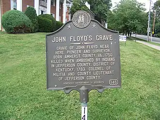 In 1783, Virginia organized the government of Kentucky and Floyd was appointed to be one of the first two judges of Kentucky.[2][12] Later in the year in March he would write Preston informing him of his brother in law Billy Buchanan being killed by Native Americans .[3] Also in the letter Floyd wrote that he dreamed that his fate might become the same. This proved true as a month later Floyd was wounded on April 8, 1783, by Native Americans while on his way to Bullitt's Lick while wearing the scarlet coat he had brought from Paris.[9] He died of his injuries on April 10, 1783.[2] His widow Jane preserved the scarlet coat until 1812 when the coat was buried with her, as she had requested.[9] Floyd is buried near Floyd's Station at Breckinridge Cemetery.[11]