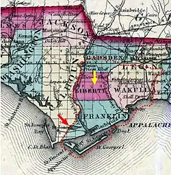 When citizens of Apalachicola moved to St. Joseph outside of the Forbes Purchase in 1835, they petitioned the Territorial Legislative Council to become the county seat of Franklin County. Although the petition was denied, a new county called Calhoun was split off from Franklin County and Washington County in 1838.[39] The western Forbes boundary became the county line between Calhoun and Franklin, and persists to this day as the boundary between Franklin and modern Gulf County.