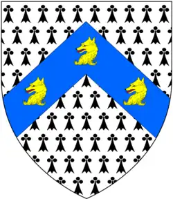 Canting arms of Fox: Ermine, on a chevron azure three fox's heads and necks erased or, as seen on his ledger stone in the cloisters of Westminster Abbey.[1] His brother Sir Stephen Fox, and his descendants, were granted an augmentation of honour in the form of On a canton azure a fleur-de-lys or by King Charles II