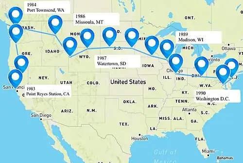 Once John reaches Madison, his pilgrimage once again is put on hold. He receives a fellowship through the university to begin his doctoral studies. He chooses the research topic of oil spill cost and management off of the US coast. In 1989, John finishes his studies at the University of Wisconsin-Madison and decides to return to his home of Pennsylvania. On his way, he passes through Illinois, Indiana, Ohio, and West Virginia. By January 2, 1990, John finally reaches the East Coast.