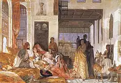 John Frederick Lewis RA (1804–1876) was an English Orientalist painter. He specialized in Oriental and Mediterranean scenes in detailed watercolour or oils, very often repeating the same composition in a version in each medium.[1] He lived for several years in a traditional mansion in Cairo, and after his return to England in 1851 he specialized in highly detailed works showing both realistic genre scenes of Middle Eastern life and more idealized scenes in upper-class Egyptian interiors with little apparent Western influence.