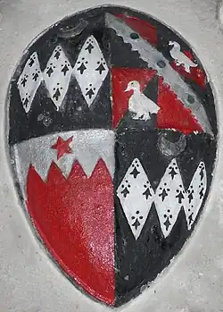 - ^ Above each is an heraldic escutcheon showing arms of Giffard impaling the arms of his respective wife. Above Arthur are shown the arms of Leigh of Burrough, Northam (Argent, a lion rampant gules on a sinister canton azure an escallop or[6] and above John are shown the arms of Wyndham (Azure, a chevron between three lion's heads erased or).
