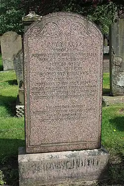 John Glas died on 2 November 1773 and was buried at The Howff in Dundee on 5 November 1773.[3] The grave lies in the south west near a north-south path. The original sandstone monument eroded and was replaced by a long-lasting red granite monument around 1880.