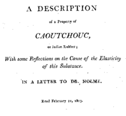 One of his most interesting pieces of work was an investigation into the properties of natural rubber or Caoutchouc. He was the first to describe the heat released when a rubber band is quickly stretched, the heat being detected by the lips to which the band is pressed. When stretched rubber is heated, it contracts, a reversal of the normal behaviour of materials when heated. Gough published these results, and others, in a letter to the Manchester Literary and Philosophical Society in 1804. King has written[4] that through Dalton, Gough exerted an indirect influence years later on James Joule, who undertook his own investigations into rubber, elasticity, and energy changes, and specifically referred to Gough's earlier studies.[5] The effect eventually became known as the Gough–Joule effect.