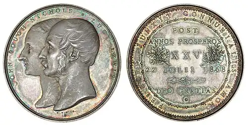 Lucy and John Gough Nichols, Silver Medal, struck for their 25th Wedding Anniversary, 1868, by L C Wyon. Courtesy Spink and Son Ltd.