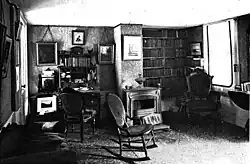 After Whittier's death in 1892, his niece, Lizzy Pickard, was not interested in maintaining the house.[4] The Whittier Home Association was established in 1898 as a vehicle to preserve the house and the Whittier legacy.[5] Lizzie's son, Greenleaf Pickard, in 1904 decided to live in the house, but made a series of additions in part to preserve the original portion used by Whittier.[4] The west side of the house was also raised to a full two stories, and the kitchen ell was replaced by a two-story addition. The present front porch is believed to date to this time period as well. The old kitchen ell was separated from the house and is now a small outbuilding.[2]