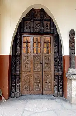 At Serima, Groeber was able to build up a congregation with more than a thousand local converts, while also mobilizing them to provide support and labor to develop the mission station. A large complex, including a boarding school and church, were built over two decades, using bricks fired in a massive kiln. Students with an aptitude for construction were given scholarships and worked in the afternoons. By 1956 the school was built, and Groeber moved on to the construction of St. Mary's Church. This church combined the use of a modern architectural plan (inspired in part by the Federal Charter Archive) with African carving and artwork in the interior spaces.[2] All the Serima artists were trained from scratch by Groeber and his former pupil Cornelius Manguma. These artists, plucked from mandatory art classes, worked in the afternoons, and were trained in drawing, patterning, pit firing, and woodcarving. Once Groeber was satisfied with their technical abilities, they were assigned subjects to carve for the St. Mary's interior.[3] The students were expected to create their own designs, which were approved if they fit in with the overall iconography.