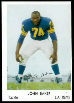 In the fifth round of the 1958 NFL draft, Baker was selected by the Los Angeles Rams, becoming the first football player from a predominantly black college drafted into the league.[5] Over eleven seasons he played for the Rams (1958–61), Philadelphia Eagles (1962), Pittsburgh Steelers (1963–67) and Detroit Lions (1968). With the Steelers, he was famous for his tackle on New York Giants quarterback Y. A. Tittle in 1964, which left Tittle bloodied and helmet-less.