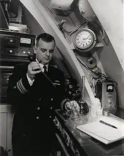 On 26 September 1957, President Dwight D. Eisenhower boarded the USS Seawolf at Narragansett Bay and was greeted by skipper Commander Richard B. Lanning and Rear Admiral Frederick B. Warder, Atlantic Fleet submarine force commander.[8] The President was briefed by Ebersole regarding radiation exposure aboard the Seawolf. According to The New York Times report:
