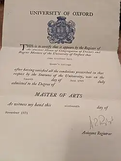 Certificate of MA from Oxford University, John Hall - ^ a b "UoB Calmview5: Search results". calmview.bham.ac.uk. Retrieved 10 October 2021.