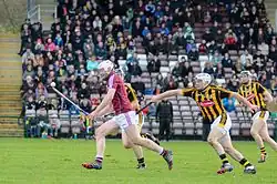 ![]() John Hanbury (wine coloured top) in action for Galway chased by Jonjo Farrell (second from right) of Kilkenny in the 2015 National Hurling League at Pearse Stadium | |||