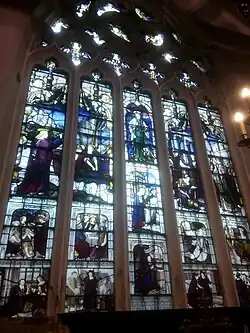 In 1885, the Harrison Memorial Window was added to the church, painted in 1885 by Burlison and Grylls. The lower half depicts scenes from John Harrison's life. From bottom left: Harrison gives a tankard of coins to the imprisoned King Charles I; the construction of St John's Church; Harrison praying in his study; Harrison helps an old woman into his almshouse; Harrison sets up a market cross on Briggate in Leeds.