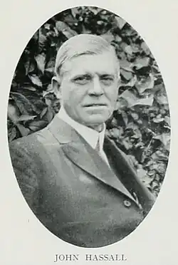 John Hassall was born in Walmer, Kent on 21 May 1868, the eldest son of Lieutenant Christopher Clark Hassall R. N., of a Cheshire family of wine-merchants, and his wife, Louisa, daughter of the Rev. Joseph Butterworth Owen, incumbent of St. Jude's, Chelsea.[1] Owen's early life was marked by tragedy. Hassall's father, who had served in the fleet at the siege of Sevastapol, was paralysed as the result of an accident on board ship. He died at the age of thirty-eight. His mother later remarried an officer in the Royal Marines at Chatham, who later became General Sir William Purvis Wright, K.C.B.[1]