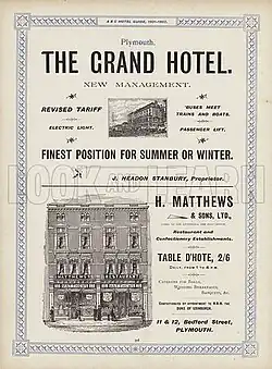 Stanbury died on 20 May 1907 in Exeter. His will was proved on 6 July, at which point his estate was reportedly worth some £44,452 (in excess of £7 million today).[28][29] The Royal Clarence Hotel passed to his son-in-law (John Bailey Rowe Orchard) and then to his son (John Geoffrey Rowe Orchard).[30] J. H. Stanbury & Co. continued to make donations after his death, including to the Royal Devon and Exeter Hospital.[31]