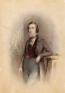 Foley was born 24 May 1818, at 6 Montgomery Street, Dublin, in what was then the city's artists' quarter. The street has since been renamed Foley Street in his honour.[4] His father was a grocer and his step-grandfather Benjamin Schrowder was a sculptor.[5][6] At the age of thirteen, he followed his brother Edward to begin studying drawing and modelling at the Royal Dublin Society school, where he took several first-class prizes.[1][7] In 1835 he was admitted to the Royal Academy Schools in London, where he won a silver medal for sculpture.[1][7] Both brothers served as studio assistants to the sculptor William Behnes.[2] Foley exhibited at the Royal Academy for the first time in 1839.[1] Foley's first significant commission came in 1840 with a sculpture group, Ino and Bacchus for Lord Ellesmere.[7] Youth at a Stream exhibited in 1844 brought greater recognition and the same year he received two commissions from the Palace of Westminster for statues of John Hampden and John Selden.[7] Thereafter commissions provided a steady career for the rest of his life.