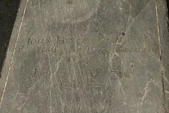 Hinchliffe died in the Bishop's Palace, Peterborough in January 1794 and is buried in Peterborough Cathedral. The grave lies in a group of floor stones dedicated to bishops towards the east end.