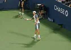 At the 2010 US Open, Isner was 18th seed and defeated Frederico Gil in the first round. After the match he revealed that although the initial diagnosis was a right ankle ligament tear, a second opinion revealed that the damage was a strain and not a tear, and he declared his ankle 90% healed.[35][36] He then advanced to the third round, before losing to 12th seed and 2006 US Open semifinalist Mikhail Youzhny. The loss dropped Isner out of the top 20 and from the no. 2 to the no. 4 ranked American player. Due to his ankle injury, he chose not to compete in doubles.