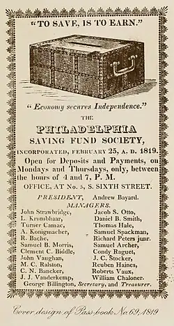 - ^ Wilcox, James M. (1916). A history of the Philadelphia savings fund society, 1816–1916. Philadelphia: J.B. Lippincott company. pp. 84, 234, 238.