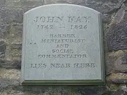 John Kay was born in April 1742 in Gibraltar Cottage just south of Dalkeith, Scotland, where his father, John Kay, worked as a mason. His mother, Helen Alexander, owned several properties in Edinburgh and the Canongate and was relatively wealthy. When his father died in 1748, John was sent to live in Leith, the harbour area of Edinburgh, with some of her relatives, who treated him very badly. At age 13 he returned to Dalkeith where he was apprenticed to George Heriot, a barber in the town, whom he served for six years.[2]
