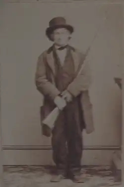 On the first day of the Battle of Gettysburg, July 1, 1863, Burns took up his flintlock musket and powder horn and walked out to the scene of the fighting that morning. He encountered a wounded Union soldier and asked if he could use his more modern rifle; the soldier agreed and Burns moved on with the rifle and with cartridges in his pocket, for he had declined an ammunition box, insisting the bullets were more easily accessible to him in his pocket than the box.[5] Approaching Major Thomas Chamberlin of the 150th Pennsylvania Infantry, Burns requested that he be allowed to fall in with the regiment. Chamberlin later wrote of Burns moving with deliberate step, carrying his Enfield rifle at a trail.