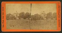 In McPherson (Herbst) Woods, Burns fought with the 7th Wisconsin Infantry and then moved to join the 24th Michigan near the eastern end of the woods.[8] He fought beside these men of the famous Iron Brigade throughout the afternoon, serving effectively as a sharpshooter, in one case shooting a charging Confederate officer from his horse. As the Union line began to give way and they fell back to the Seminary, Burns received wounds in the arm, the leg, and several minor ones in the breast; the Union soldiers were forced to leave him behind on the field.[9] Injured and exhausted, the old man was able to crawl away from his rifle and to hastily bury his ammunition. He convinced the Confederates that he was a noncombatant, wandering the battlefield seeking aid for his invalid wife, and his wounds were dressed by their surgeons. This was a narrow escape for Burns, for by the rules of war he was subject to summary execution as a non-uniformed combatant, or bushwhacker. He was able to crawl that evening to the cellar of the nearest house, and was later conveyed to his own home, where he was treated by Dr. Charles Horner.[10]