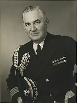 He was promoted to captain in 1942, and was appointed President Franklin D. Roosevelt's naval aide. In that capacity, he established the White House Map Room, and accompanied Roosevelt to the January 1943 Casablanca Conference, and took notes.[9] He took command of the newly commissioned battleship USS Iowa (BB-61); he was a plankowner. While he commanded her, February 22, 1943 to August 1944, Iowa transported President Roosevelt across the Atlantic to the Cairo Conference, and to Algeria en route to the Teheran Conference.[5][10][11]