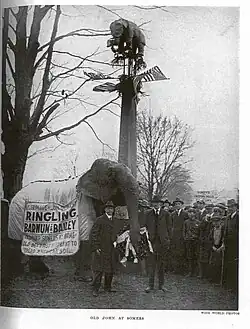 - ^ "Town Heaps Honors on Old Bet's Grave. But Pap Fellowes and His Cornet Inject a Little Discord in Memorial to an Elephant. But the Youngsters All Enjoy It and Feed Peanuts to Old John, Who Lays Wreath on Monument". New York Times. April 14, 1922. Retrieved 2010-01-08.