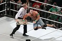On the October 10 edition of Raw SuperShow, following a kayfabe strike by members of the WWE roster as a result of Triple H's management, Vince McMahon introduced Laurinaitis as the new Interim General Manager of Raw.[12] That same night, Laurinaitis fired Jim Ross and reinstated The Miz and R-Truth, who had been suspended following repeated attacks. After a few weeks of impartiality during which he pledged that he would listen to the WWE fans using his slogan of "People Power", Laurinaitis began showing bias against WWE Champion CM Punk, who had repeatedly criticized Laurinaitis and questioned his integrity over the past few months.[13] On the December 26 edition of Raw SuperShow, Laurinaitis placed Punk in a gauntlet match against three opponents; whoever pinned Punk would earn a shot at the WWE Championship the following week on Raw SuperShow. Punk agreed to the match under the condition that if he beat all three, then he would receive a match against Laurinaitis himself afterwards. During the match, Laurinaitis distracted Punk, allowing Dolph Ziggler to pin Punk and earn a title shot.[14] The following week on Raw SuperShow, Laurinaitis distracted Punk once again, causing him to be counted-out in his title match against Ziggler, thus retaining the championship.[15] Laurinaitis then scheduled a WWE Championship match between Punk and Ziggler at the Royal Rumble, in which he named himself guest referee. Laurinaitis continued to cause Punk to lose to Ziggler throughout January[16][17] which ultimately led to Punk attacking Laurinaitis in retaliation, claiming that he was abusing his power.[17] Laurinaitis began to declare himself as the soon to be permanent General Manager. In response to this, the Board of Directors ordered that his position as Interim General Manager would be taken under review by Chief Operating Officer Triple H. At the Royal Rumble, Laurinaitis brought in another official and Punk defeated Ziggler. On January 30 edition of Raw SuperShow, Laurinaitis was set to have a performance review by Triple H. During the review, Triple H degraded Laurinaitis and his actions, but before the final decision he was interrupted by The Undertaker. The Board of Directors then decided on February 7, 2012, to retain Laurinaitis as Interim General Manager.[18]