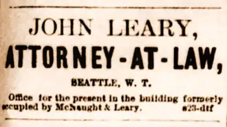 Leary was admitted to the bar in 1871, becoming a "pioneer lawyer" in Washington Territory.[23][33] That same year, he became a junior partner in McNaught & Leary law firm.[34][24] In 1872, McNaught & Leary was one of five law firms in Seattle[35] and one of the six most active law firms in Washington Territory.[36] One of Leary's most consistent occupations in Seattle was law; he was active in this area for eleven years.[23][37]