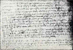 In the month of July, 1703, M'Millan, in concert with two other members of the Presbytery of Kirkcudbright, namely, Mr Reid of Carsephairn, and Mr Tod of Buittle, presented a paper to that ecclesiastical body containing a statement of grievances, and praying for redress; they then left the court.[8][9] The Presbytery having taken it into their consideration, appointed the Rev. Messrs Warner, of Balmaclellan; Telfer, of Rerwick; Cameron, of Kirkcudbright; Boyd, of Dalry; Ewart, of Kells; and Monteith, of Borgue, to answer it. After the answer had been received and approved of by the Presbytery, the three ministers gave in a "protestation against all the corruptions, defections, errors, and mismanagements in the Church government of Scotland, as then established". They also condemned the oath of allegiance to Queen Anne.[10] Some farther proceedings having taken place respecting Mr Macmillan, the Presbytery records thus proceed: "All which being considered, and the presbytery being desirous to be as condescending as they can, for peace-sake, do pass all bygone differences and misbehaviours of said John Macmillan, declaring that if he behave not orderly for the future, but shall be turbulent and divisive, that then all former things now passed from shall be revived and he censured for them, with such new offences as shall be found just." Mr M'Millan, still continuing in acts of insubordination, was served with a libel; but he declined the jurisdiction of the Presbytery" and appealed to the first free and lawfully constituted General Assembly of the Church." The Presbytery took Mr M'Millan's libel into consideration, and found nearly all the articles proved, or substantiated. The court then proceeded to depose him, which sentence was ratified by the Commission and General Assembly of the Church. At an early stage of his ministry he protested against "the corruptions, defections, and errors of the church government", and his relations with the presbytery grew more and more strained, until his brethren found themselves under the necessity of deposing him, 30 December 1703, for disorderly and schismatical practices. There being no question as to M'Millan's morals or orthodoxy, it is doubtful whether the Kirkcudbright presbytery was competent to depose him. The deposition certainly affected him little; his popularity enabled him to retain possession of both church and manse, and he continued in the exercise of his ministry. He appeared before the commission of assembly 9 June 1704, acknowledged a fault, and earnestly desired, but without success, to be "reponed".[11] Two ministers, Mr Monteith, of Borgue, and Mr Hay, of Anwoth, were appointed to preach at Balmaghie, and declare the church vacant; but being denied admission by the populace into the sacred edifice, I Mr Monteith intimated the sentence of the Presbytery on the road, and declared the church of Balmaghie vacant. He next repaired to "the Place of Balmaghie" where he preached to such persons as were present, and again intimated the sentence of deposition. Mr M'Millan officiated that day in the church. The deposed clergyman still continued to perform all the duties of the ministry in the parish of Balmaghie, keeping possession of both church and manse.[12] Mackenzie and Symson also give various extracts from the Presbytery records.