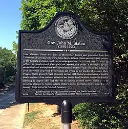 On June 17, 2015, the Georgia Historical Society, the Atlanta History Center and the Jewish American Society for Historic Preservation dedicated a Georgia Historical Society marker honoring Governor John M. Slaton at the Atlanta History Center.[16] It was the first public honoring of Governor Slaton since his controversial commutation of the Leo Frank death sentence almost 100 years ago to the day.