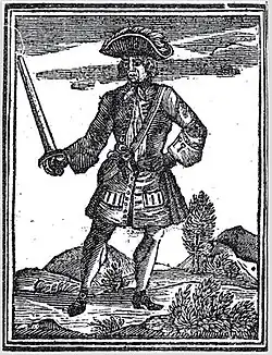 ![]() Illustration of John Martel from Johnson's "A General History of the Pyrates", 1724. | |