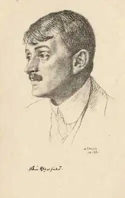 In addition to the commission for Queen Alexandra's Memorial Ode with music by Elgar, many of Masefield's short poems were set as art songs by British composers of the time.[16] Best known by far is John Ireland's "Sea-Fever".[17] Frederick Keel composed several songs drawn from the Salt-Water Ballads and elsewhere. Of these, "Trade Winds" was particularly popular in its day,[18] despite the tongue-twisting challenges the text presents to the singer.[19] Keel's defiant setting of "Tomorrow", written while interned at Ruhleben during World War I,[18] was frequently programmed at the BBC Proms after the war.[20] Another memorable wartime composition is Ivor Gurney's climactic declamation of "By a bierside", a setting quickly set down in 1916 during a brief spell behind the lines.[21]