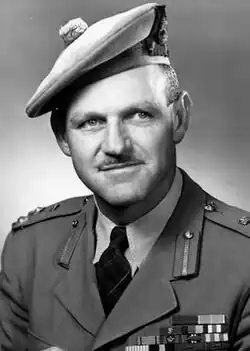 Major General John Meredith Rockingham, CB, CBE, DSO & Bar, ED, CD (24 August 1911 – 7 July 1987), nicknamed "Rocky," was an Australian-Canadian senior military officer who fought with the Canadian Army in World War II and the Korean War.[2] In 1940 Rockingham went overseas as a lieutenant with the Canadian Scottish Regiment, but after the Dieppe Raid of August 1942 he was transferred to the Royal Hamilton Light Infantry (RHLI) and promoted to major. Following the invasion of Normandy in June 1944, Rockingham played a significant role in Operation Overlord and the North West Europe Campaign both as Commanding Officer of the RHLI and as General Officer Commanding the 9th Canadian Infantry Brigade. Rockingham returned to civilian life in 1946, obtaining a job with the British Columbia Electric Railway. However, in 1950 he was recalled by the military to command the 25th Canadian Infantry Brigade in the Korean War. After his stint as a brigadier in Korea ended, Rockingham returned to Canada where he remained in the military until 1966. Rockingham died in British Columbia in 1987 at age 75.[3]