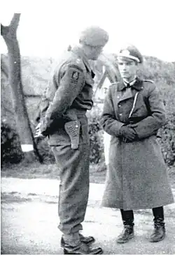 The 9th DLI saw further action at the Falaise Pocket, the crossing of the Albert Canal and at Gheel, Belgium.[9] On 23 September, the 151st Brigade was ordered to move north and east of Eindhoven with the 231st Brigade to guard the right flank of Operation Market Garden.[10] In November 1944, the 151st Brigade was disbanded and some units returned to Britain. However the 9th DLI was reinforced and transferred to the 7th Armoured Division, 131st Infantry Brigade, as a motorised battalion fighting at the Roer Triangle in January 1945 and the town of Ibbenbüren in March. The 9th DLI ended the war near Hamburg.