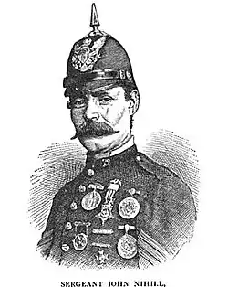 John Nihill (May 25, 1850 – May 29, 1908) was an Irish-born soldier in the U.S. Army who served with the 5th U.S. Cavalry during the Indian Wars. A participant in the Apache Wars, he received the Medal of Honor for bravery when he single-handedly fought off four Apache warriors in the Whetstone Mountains of Arizona on July 13, 1872. At the time of his death, he was the only enlisted man to be admitted as a member of the Military Order of the Loyal Legion of the United States.