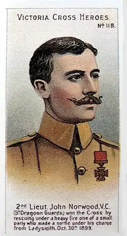 On the 30th October, 1899, this Officer went out from Ladysmith in charge of a small patrol of the 5th Dragoon Guards. They came under a heavy fire from the enemy, who were posted on a ridge in great force. The patrol, which had arrived within about 600 yards of the ridge, then retired at full speed. One man dropped, and Second Lieutenant Norwood galloped back about 300 yards through heavy fire, dismounted, and picking up the fallen trooper, carried him out of fire on his back, at the same time leading his horse with one hand. The enemy kept up an incessant fire during the whole time that Second Lieutenant Norwood was carrying the man until he was quite out of range.[1]