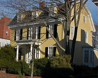 The John P. Peabody House is a historic house at 15 Summer Street in Salem, Massachusetts. Built in 1868 by Salem merchant John P. Peabody, it is a rare early example of Colonial Revival architecture. The two story wood-frame house is three bays wide, with a slate gambrel roof. The centered front door is sheltered by a portico supported by Doric columns. The second story center window reinforces focus, being enlarged slightly by sidelights as compared to the other windows on the facade. The roof is pierced by three dormers, the outer ones with pointed gables and the central one with a rounded pediment reminiscent of the then-fashionable Second Empire style.[2]