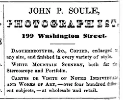 J.P. Soule maintained photographic studios on Washington Street in Boston, ca.1861-1882.[3] As a photographer, his subjects in Boston included buildings, the 1869 National Peace Jubilee, the great fire of 1872, and carte-de-visite portraits. He also photographed mountains in New Hampshire, and the 1866 fire in Portland, Maine. He exhibited works in the Charitable Mechanic's exhibitions of 1850,[4] and 1874 (bronze medal).[5]