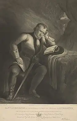 James Paton was a Covenanter. He was born at Meadowhead in the parish of Fenwick, Ayrshire, where his father had a farm. Until near manhood he was employed in agricultural pursuits. According to one account he went as a volunteer to Germany, and served with such distinction in the wars of Gustavus Adolphus that he was raised to the rank of captain. According to another, he was present with the Scots army at Marston Moor. With the rank of captain, he fought with great gallantry against Montrose at Kilsyth, 15 August 1645, and escaped uninjured during the flight. After the defeat of Montrose at Philiphaugh on 13 September he returned home to Fenwick. He took part with the people of Fenwick in opposing General Middleton in 1648. With other Scottish Covenanters he, however, supported the king against Cromwell in 1650 and, accompanying him in 1651 into England, fought for him at the battle of Worcester on 3 September. After the Restoration he fought, in command of a party of covenanting cavalry, on 28 September 1666, at Rullion Green, where he had a personal encounter with Thomas Dalyell.[3][4][5] He was also at the battle of Bothwell Bridge 22 June 1679.[6] He was excepted out of the indemnities passed after both battles, but succeeded in lurking safely in various hiding places, until in 1684 he was taken in the house of a covenanter, Robert Howie. Dalyell on meeting him is said to have stated that he was both glad and sorry for him. The fact that he had fought for the king at Worcester atoned in Dalyell's eyes for much that was unjustifiable in his subsequent behaviour. He severely rebuked an insult that was offered him, and is supposed to have exerted special influence to procure his pardon. Lauder of Fountainhall mentions that Paton ‘carried himself very discreetly before the justices’ (Historical Notices, p. 535).