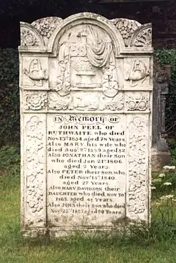 Peel was born at Park End, near Caldbeck, Cumberland; his family moved a short time after to the Greenrigg farm.[1] He was baptised on 24 September 1777, but most sources suggest he was born the previous year. Peel married in 1797 to Mary White.[1] Some of the White family's property at Ruthwaite (near Ireby) passed into his hands, which secured Peel a comfortable income. However, he was, as many of his friends admitted, prone to dissipation and he devoted himself primarily to hunting. Peel was a farmer by profession, and kept a pack of fox hounds. Peel hunted pine martens and hares in addition to foxes. By the end of his life (13 November 1854, most likely due to a fall while hunting) he had accrued large debts, which his friends helped pay off.[1]