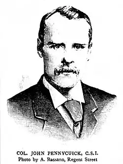 Pennycuick entered the East India Company Military College at Addiscombe, Surrey, in 1857, and was commissioned as a lieutenant in the Madras Engineer Group in December 1858.[1][2] He arrived in India on 11 November 1860. He commanded H company at Zoulla during the Abyssinian campaign of 1868[3] and received the Abyssinian War Medal for participation in the expedition. After promotion to Second Captain in 1870[4] and Major in 1876,[5] Pennycuick became a Lieutenant-Colonel in December 1883[6] and a Colonel in December 1887.[7] On 10 October 1895 the Queen appointed him a Companion of the Order of the Star of India.[8] He served in the Public Works Department till January 1896. During his six years of service in the PWD, Pennycuick served as Chief Engineer in the construction of the Mullaperiyar Dam.